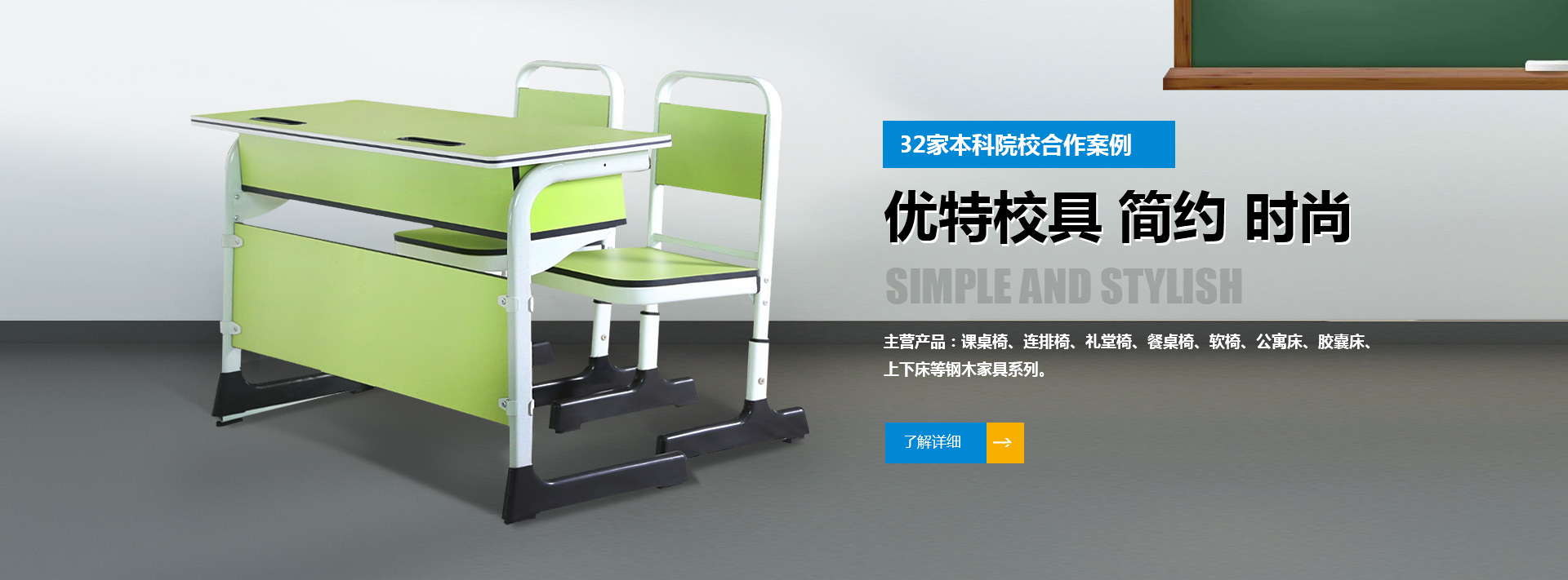 我公司位于河南省偃師市首陽山鎮石橋村北環工業區,是集研發、制造、銷售、服務為一體的綜合性學生課桌椅廠家,產品主要有課桌椅、連排椅、禮堂椅、餐桌椅、軟椅、公寓床、膠囊床、上下床等鋼木家具系列??筛鶕蛻粜枨筇峁┒ㄖ苹桨?。